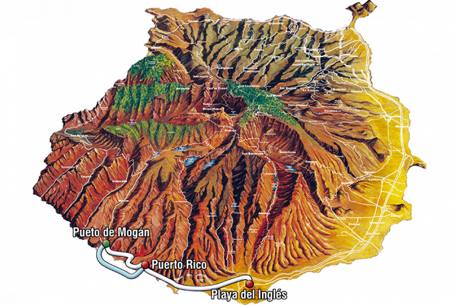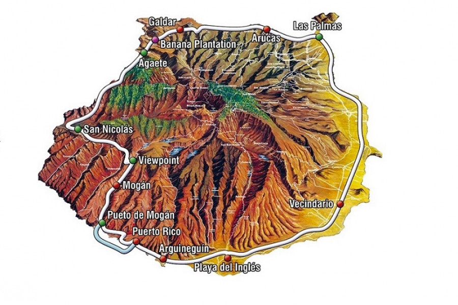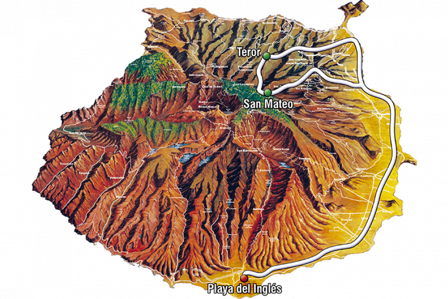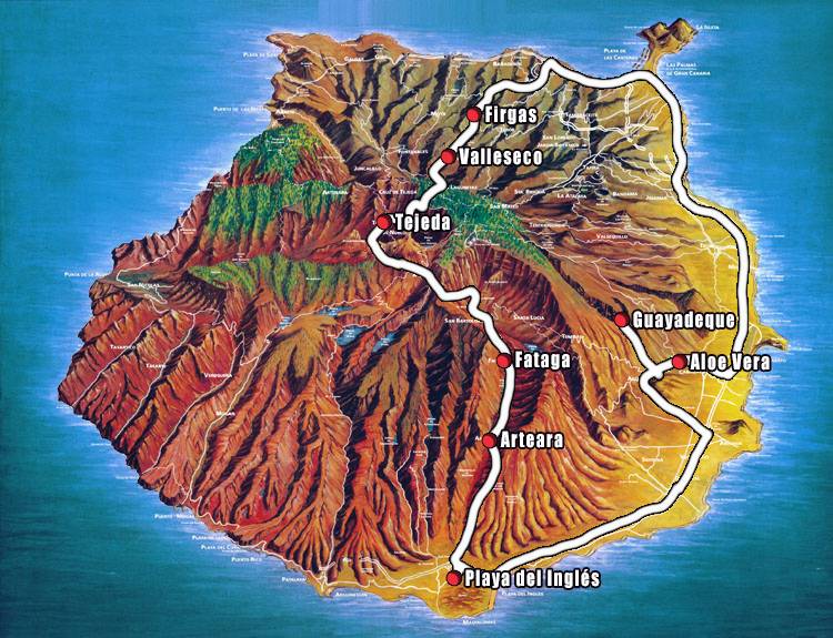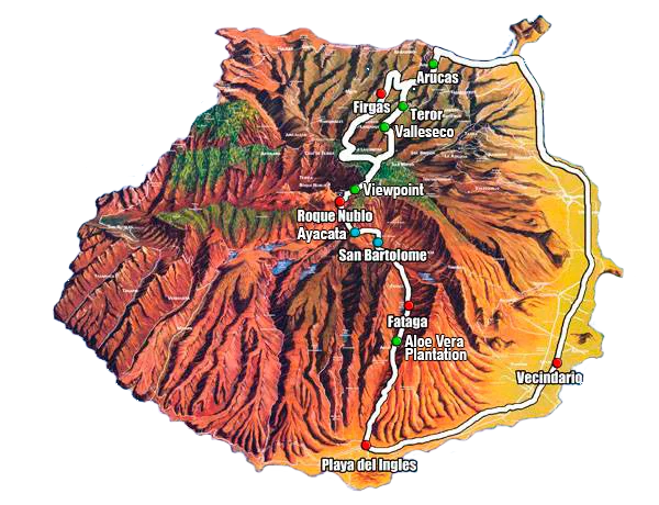 Pasamos por Tunte hasta llegar Ayacata y desde allí, se llega al punto más alto de la ruta, Tejeda, pueblo de referencia para los grancanarios. Se continúa la ruta a Artenara donde se visita sus casas cueva . Se realizará otra parada en Monte Pavón para tomar fotografías pues, si el tiempo lo permite, se puede apreciar la capital, Las Palmas de Gran Canaria y el Teide, en la isla vecina.
